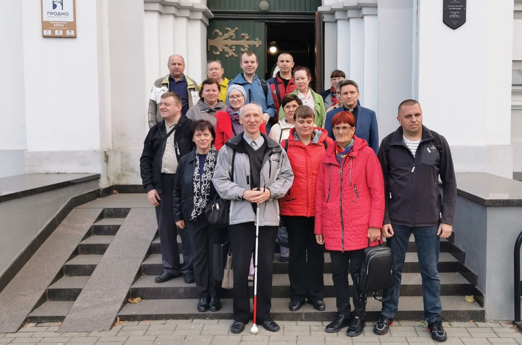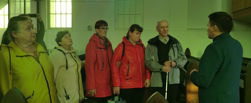 В Лютеранскую кирху им. св. Иоанна – единственно-действующий лютеранский храм в Республике Беларусь отправились 9 октября участники очередной тактильной экскурсии проекта «Архитектура в формате тифло». Пастор Владимир Татарников рассказал об истории гродненской евангелическо-лютеранской общины, которая была образована в 1779 году из лютеран немецкого происхождения, приглашённых Антонием Тизенгаузом для организации королевских мануфактур и работы на них. Участники экскурсии – люди с инвалидностью по зрению смогли прикоснуться к клавиатуре настоящего органа, привезенного из Франкфурта-на-Майне. Потрогали уникальный часовой механизм и колокола. Оценили всю аскетичность лютеранской церкви.